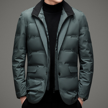 The perfect answer to unpredictable city weather. We reimagined the classic blazer with the insulated warmth of lightweight duck down, creating a sharp, hybrid silhouette. A contrasting collar and subtle embossed motif add a layer of modern refinement for a truly versatile piece.